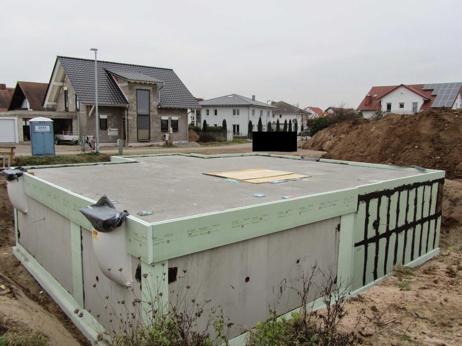 Gestern wurde die Perimeterdämmung angebracht. Die einzelnen Styrodur-Platten wurden mit einer Bitumendickmasse, die zuvor auch auf die "Nahtstellen" des Kellers aufgespachelt worden war, angeklebt und auch hinterher nochmals "verspachtelt".